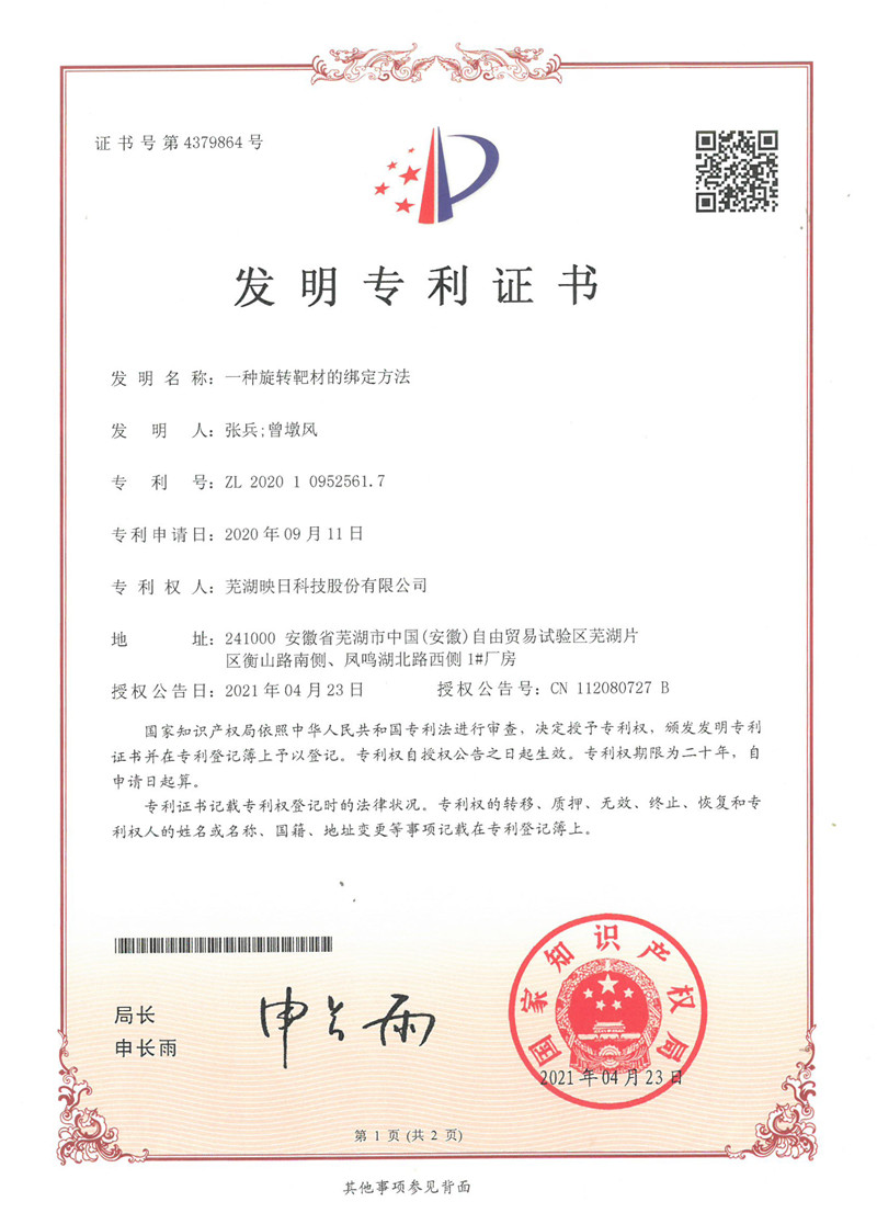 一種旋轉靶材的綁定方法 專利證書