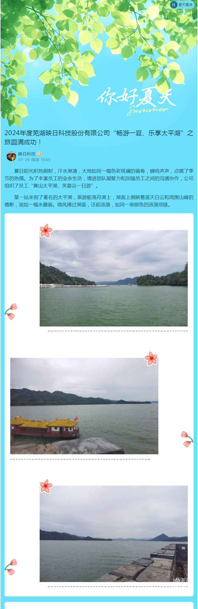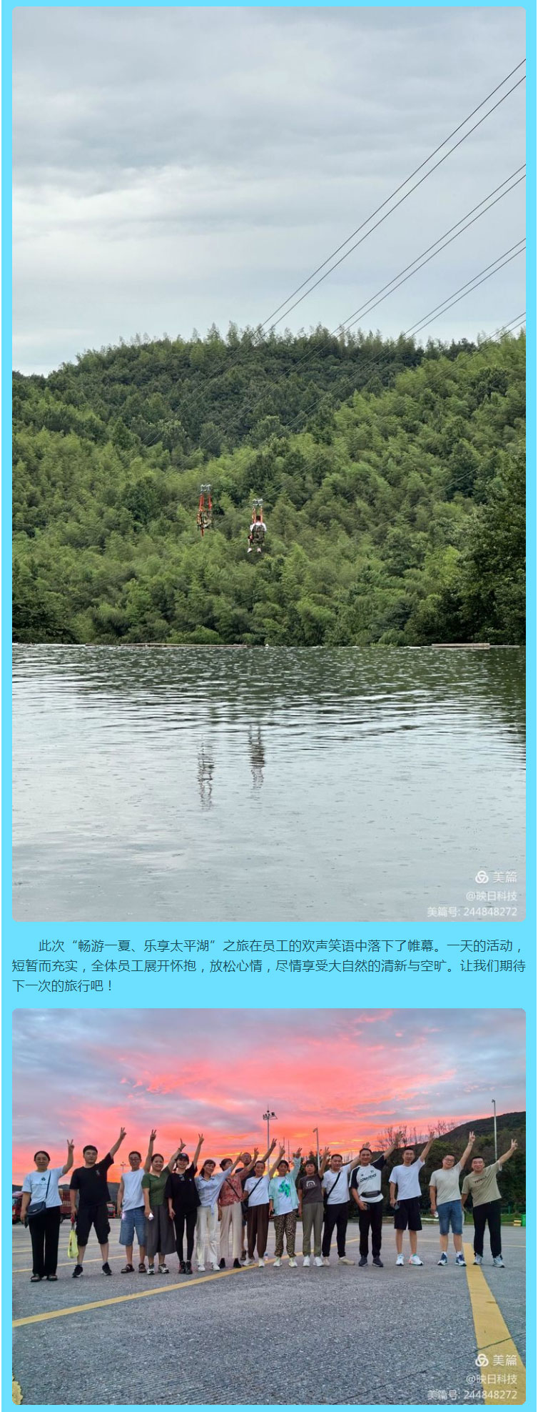2024年度蕪湖映日科技股份有限公司“暢游一夏、樂享太平湖”之旅圓滿成功! 來源: 發(fā)布時(shí)間:2024-08-05 上一條:“盡享元宵、諸事圓滿”蕪湖映日科技股份有限公司元宵節(jié)活動(dòng)圓滿成功! 下一條:“追憶崢嶸歲月,禮贊黨的輝煌”慶“七一”主題黨日活動(dòng)!